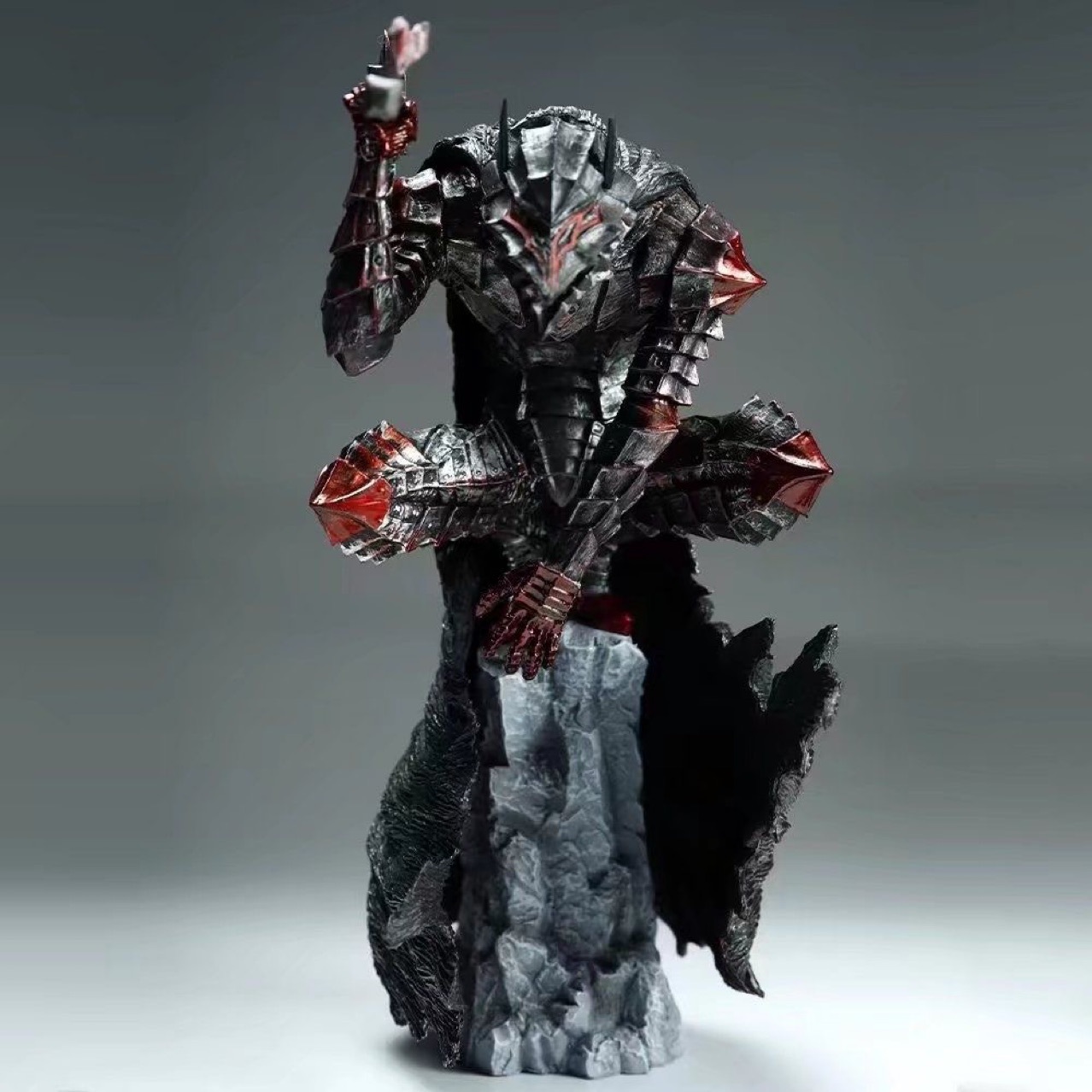 Гатс — Чёрный Мечник, выживший в аду. Огромный меч «Убийца Драконов», железная рука-протез, пустой глаз, вечная ярость. Тело в шрамах, душа в крови, на шее — клеймо, призывающее демонов каждую ночь. Он не герой — он зверь, грызущий судьбу, проклятый небом и землёй. Фигурка передаёт его тяжёлый шаг, горькую усмешку и готовность рубить даже богов.